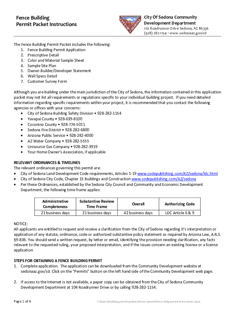 Fence Building Permit Packet InstructionsCity Of Sedna Community Development Department 102 Roadrunner Drive Sedna, AZ 86336 (928) 2821154 www.sedonaaz.gov/cdThe Fence Building Permit Packet includes