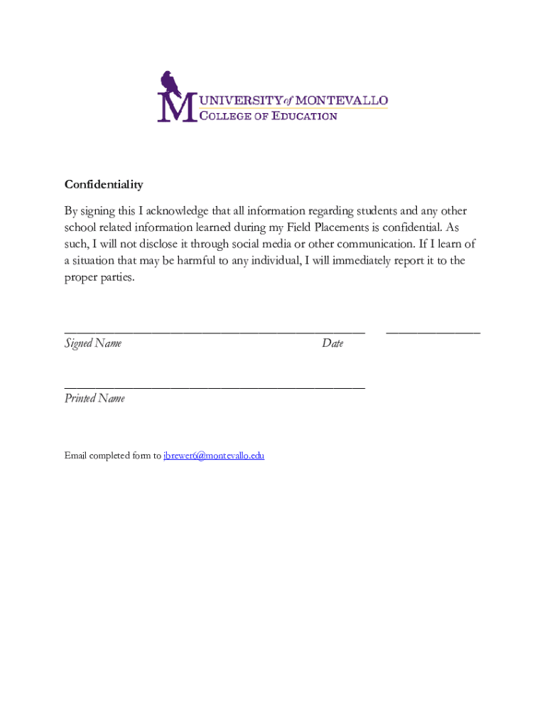 Confidentiality By signing this I acknowledge that all information regarding students and any other school related information learned during my Field Placements is confidential. As such, I will not