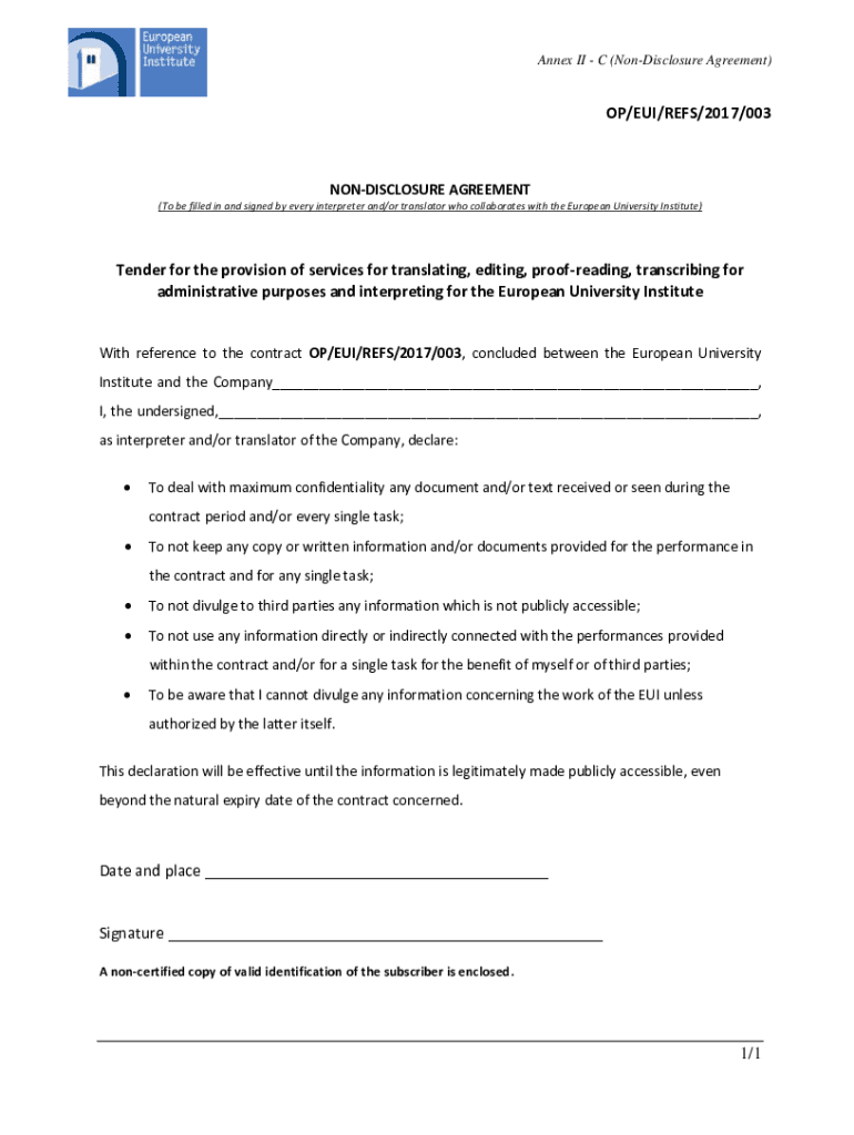 Annex II C (Nondisclosure Agreement)OP/EU/REFS/2017/003NONDISCLOSURE AGREEMENT (To be filled in and signed by every interpreter and/or translator who collaborates with the European University Institute)Tender