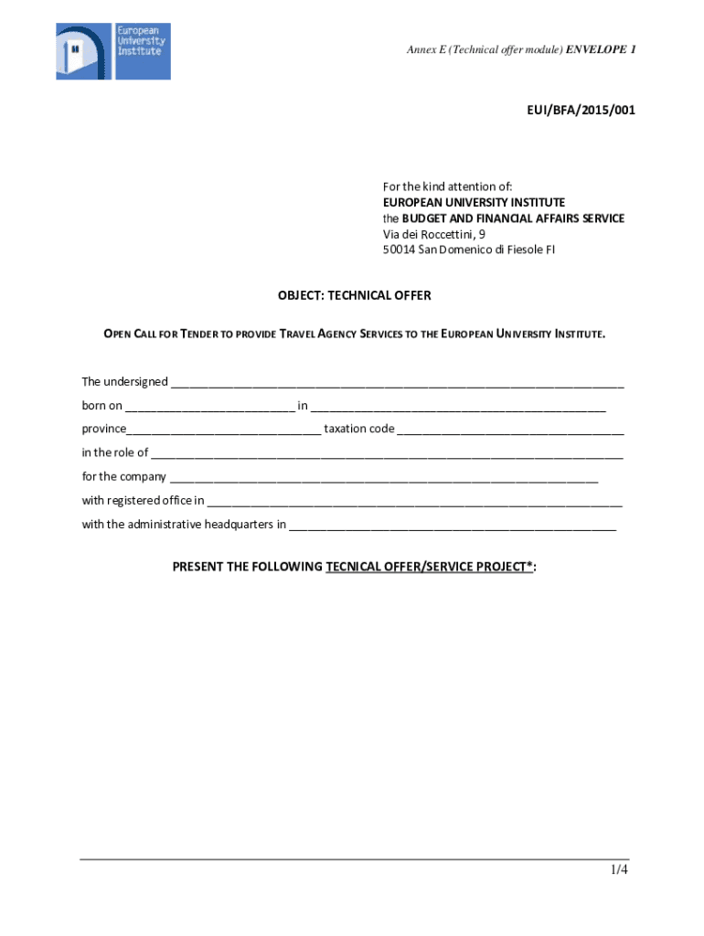 Annex E (Technical offer module) ENVELOPE 1EUI/BFA/2015/001For the kind attention of: EUROPEAN UNIVERSITY INSTITUTE the BUDGET AND FINANCIAL AFFAIRS SERVICE Via DEI Rocketing, 9 50014 San Domenico