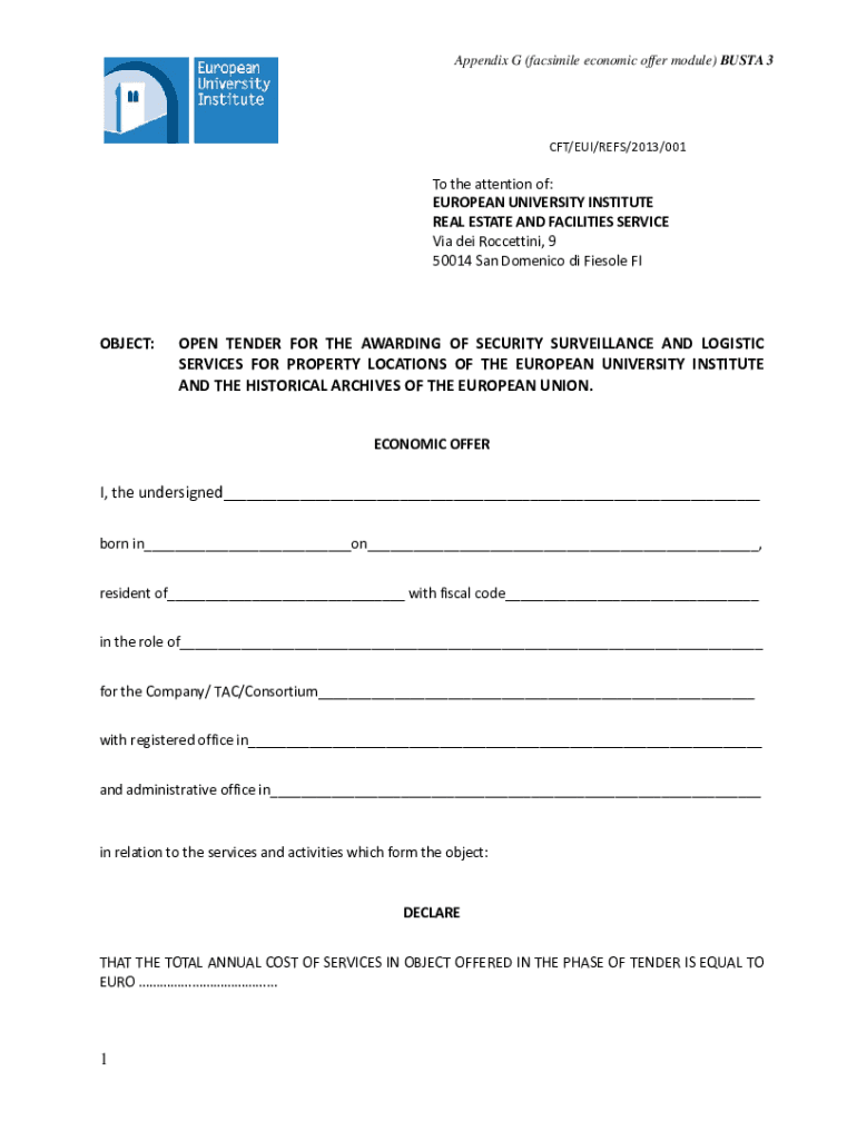 Appendix G (facsimile economic offer module) BUST 3CFT/EU/REFS/2013/001To the attention of: EUROPEAN UNIVERSITY INSTITUTE REAL ESTATE AND FACILITIES SERVICE Via DEI Rocketing, 9 50014 San Domenico