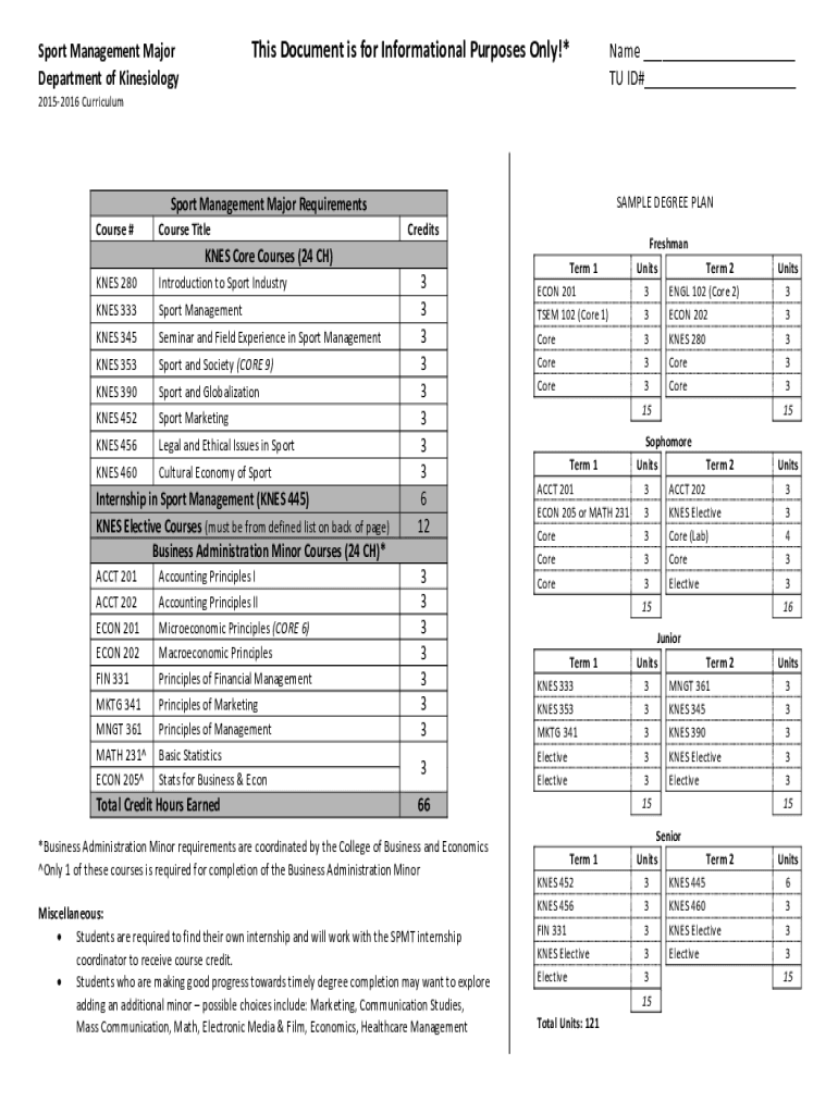 This Document is for Informational Purposes Only!*Sport Management Major Department of KinesiologyName TU ID# 20152016 CurriculumSAMPLE DEGREE PLANS port Management Major Requirements Course #Course