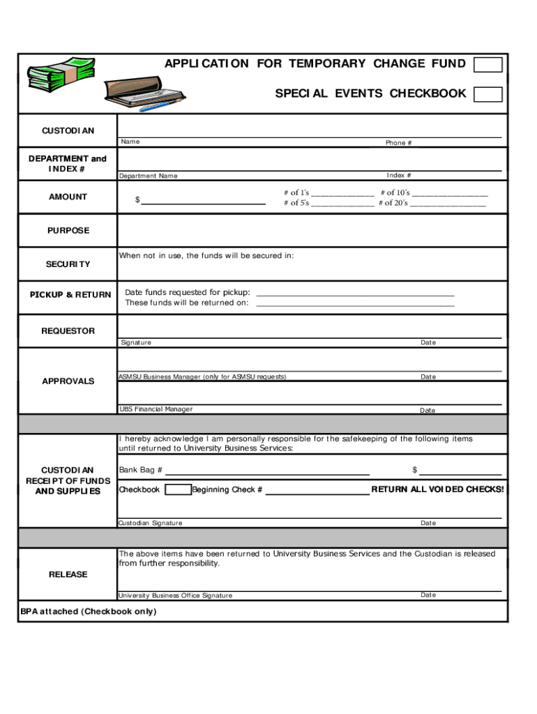 APPLICATION FOR TEMPORARY CHANGE FUND SPECIAL EVENTS CHECKBOOK CUSTODIAN NameDEPARTMENT and INDEX # AMOUNTPhone #Index #Department Name# of 1's # of 10s # of 5's # of 20s $PURPOSESECURITY PICKUP &