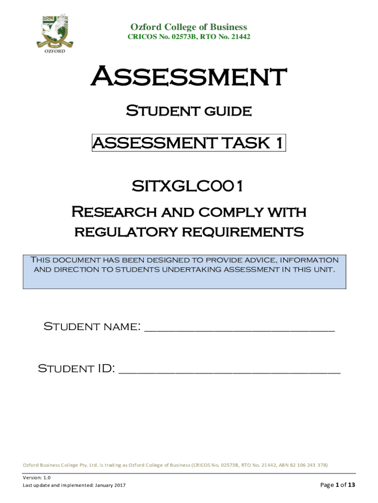 Oxford College of Business CRICKS No. 02573B, RTO No. 21442Assessment Student guide ASSESSMENT TASK 1 SITXGLC001 Research and comply with regulatory requirements This document has been designed to
