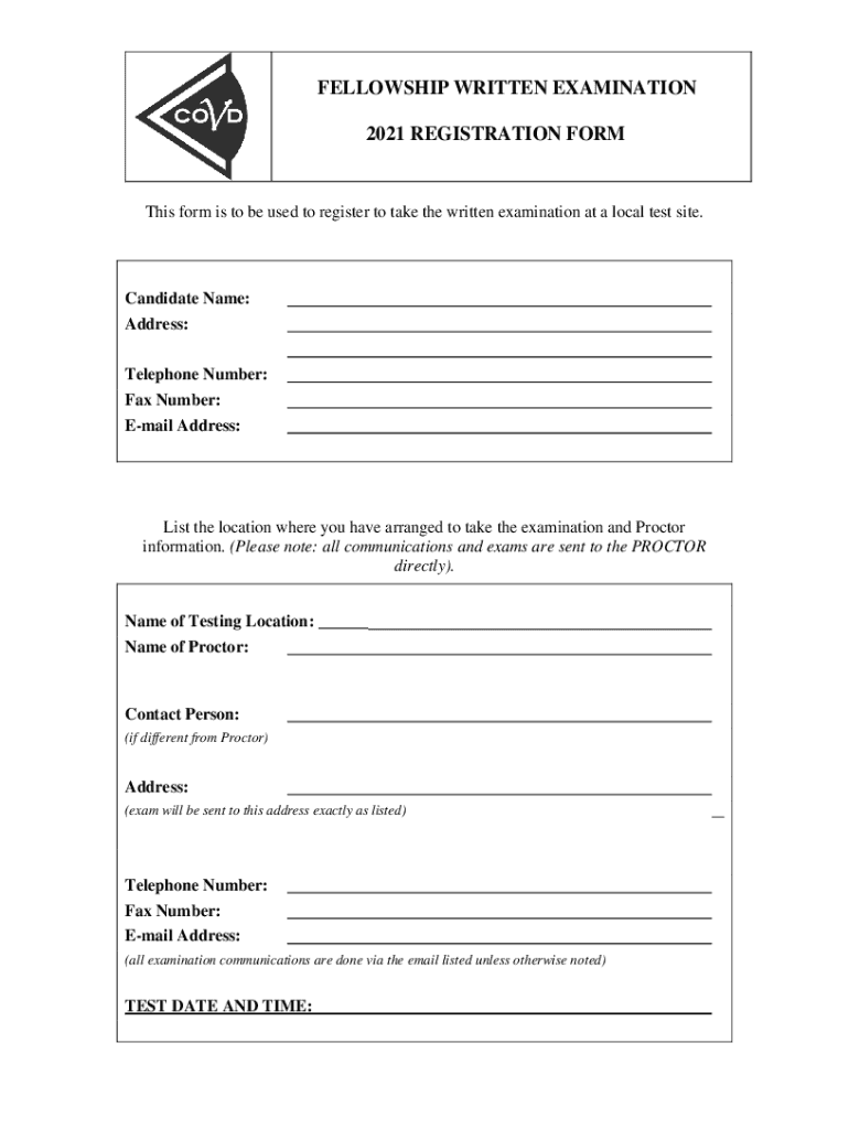 FELLOWSHIP WRITTEN EXAMINATION 2021 REGISTRATION Forms form is to be used to register to take the written examination at a local test site. Candidate Name: Address: Telephone Number: Fax Number: Email
