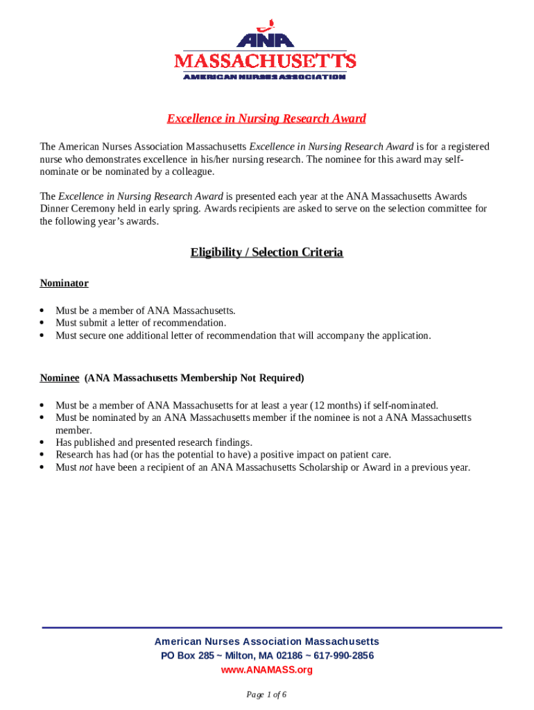 Frequently asked questions about the form The American Nurses Association Massachusetts Excellence in Nursing Research Award is for a registered nurse who demonstrates excellence in his/her nursing research