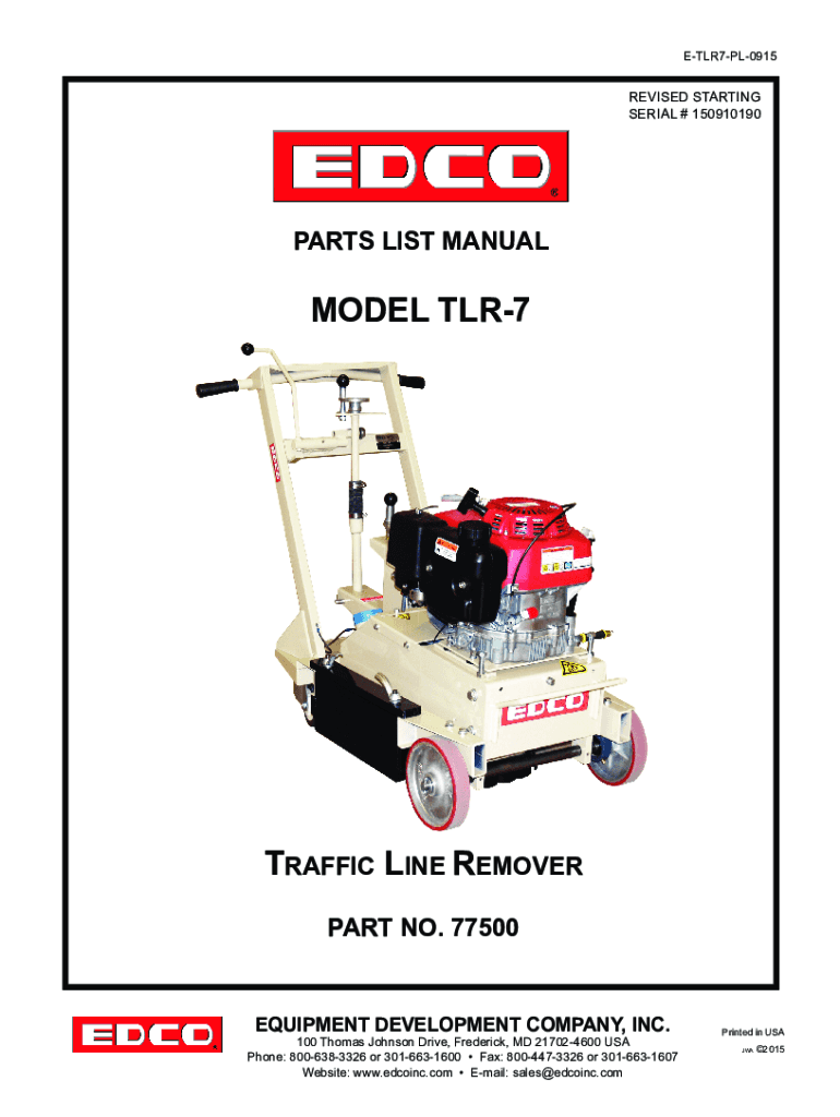 ETLR7PL0915REVISED STARTING SERIAL # 150910190PARTS LIST MANUALMODEL TLR7TRAFFIC LINE REMOVER PART NO. 77500EQUIPMENT DEVELOPMENT COMPANY, INC.100 Thomas Johnson Drive, Frederick, MD 217024600 USA