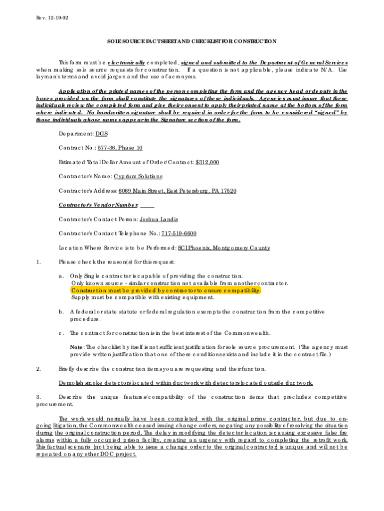 Rev. 121902SOLE SOURCE FACT SHEET AND CHECKLIST FOR CONSTRUCTION