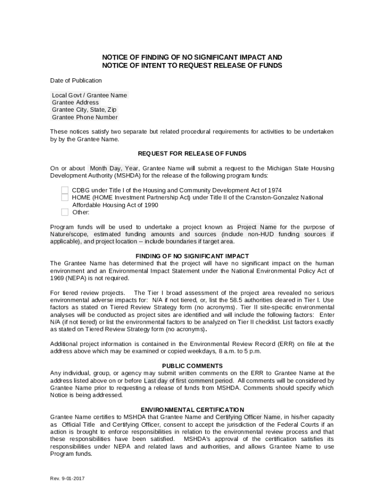 What is notice of finding of no significant impact and - State of Michigan Form?