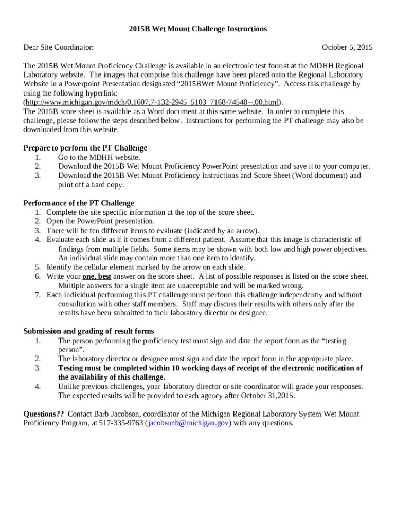 - Look for the The 2015B Wet Mount Proficiency Challenge is available in an electronic test at at the MDHH Regional Laboratory website form in PDFfiller’s catalogue.