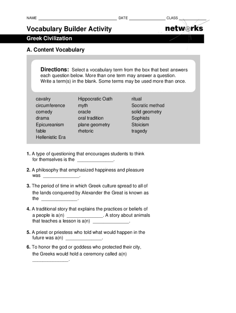 A. Content VocabularyDirections: Select a vocabulary term from the box that best answers