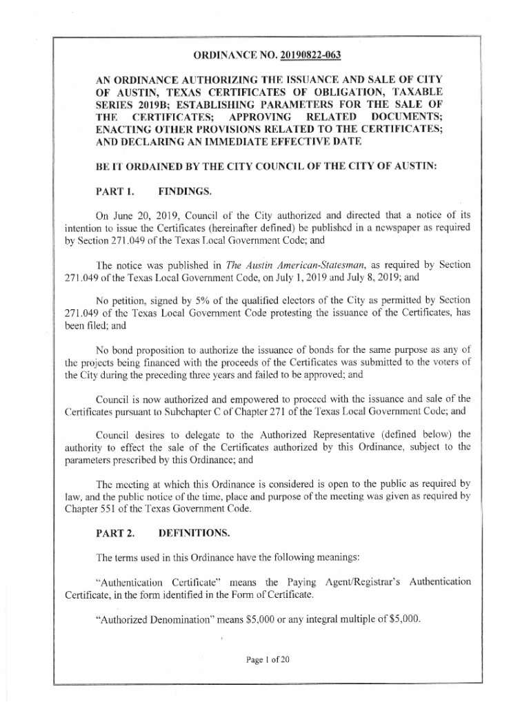 OF AUSTIN, TEXAS CERTIFICATES OF OBLIGATION, TAXABLE