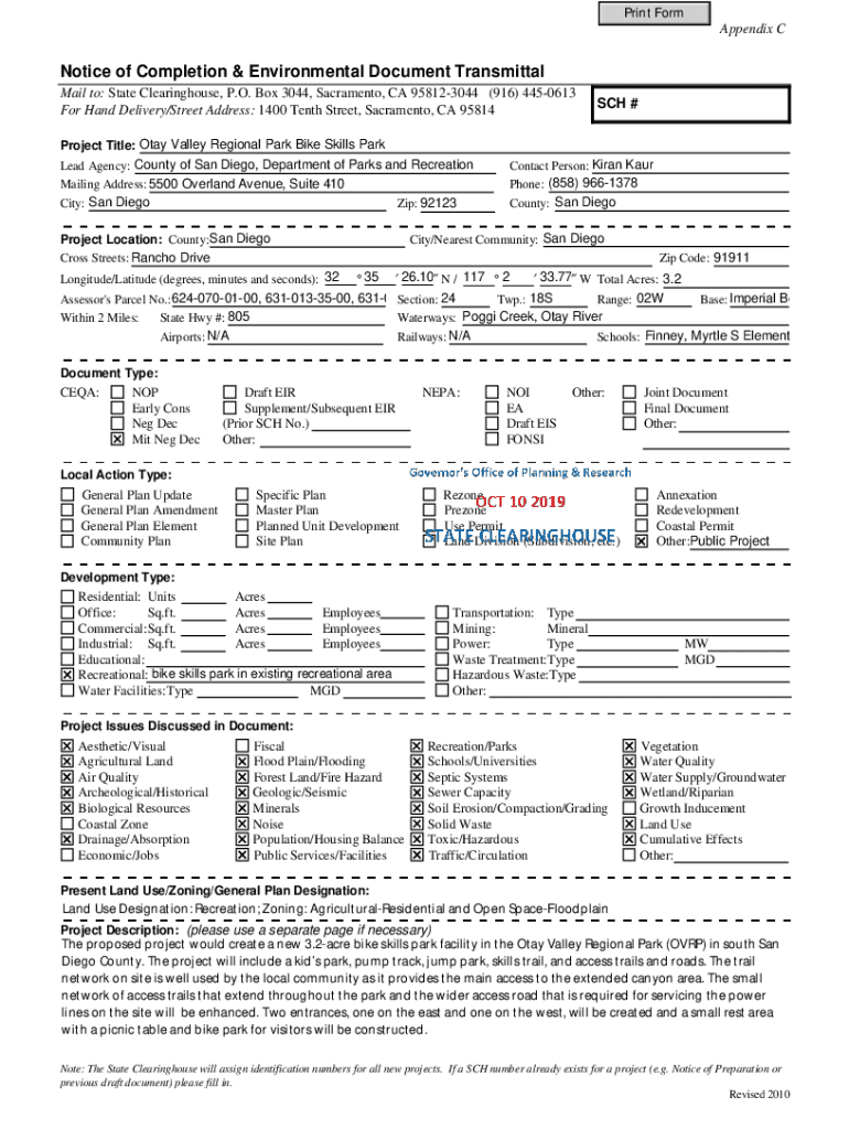 Print Form Appendix Notice of Completion & Environmental Document Transmittal Mail to: State Clearinghouse, P.O. Box 3044, Sacramento, CA 958123044 (916) 4450613 For Hand Delivery/Street Address: