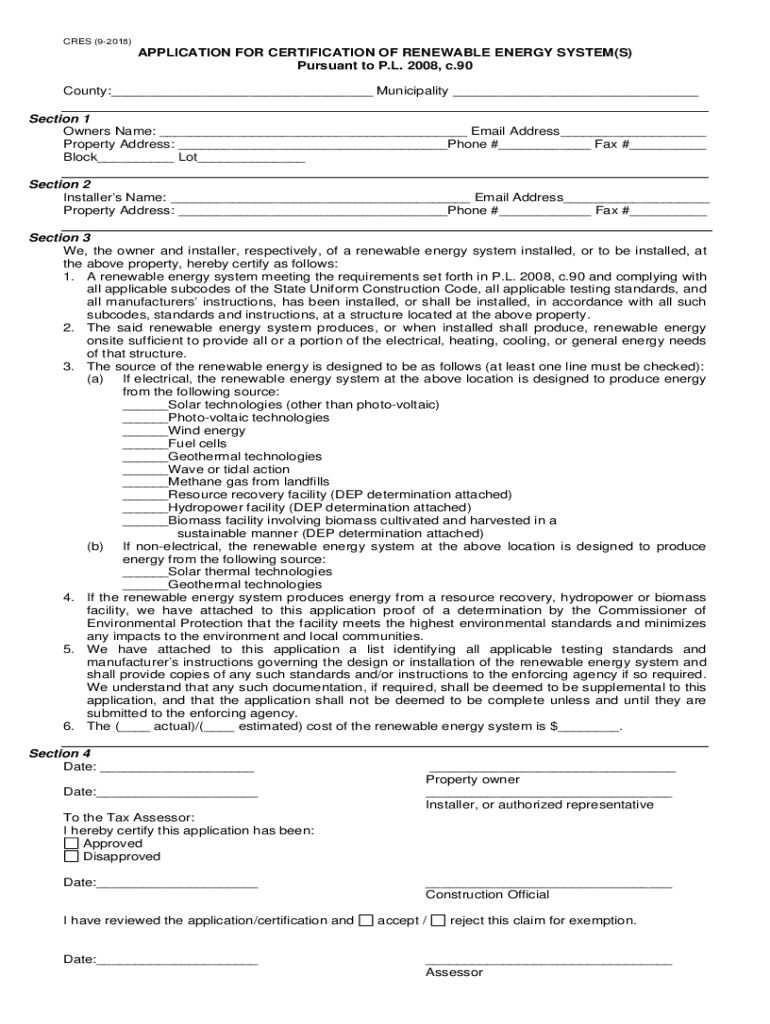 CREW (92018)APPLICATION FOR CERTIFICATION OF RENEWABLE ENERGY SYSTEM(S) Pursuant to P.L. 2008, c.90 County: Municipality Section 1 Owners Name: Email Address Property Address: Phone # Fax # Block