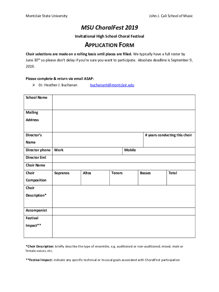 Montclair State University John J. Cali School of Music MSU Chorales 2019 Invitational High School Choral FestivalAPPLICATION FORM Choir selections are made on a rolling basis until places are filled.