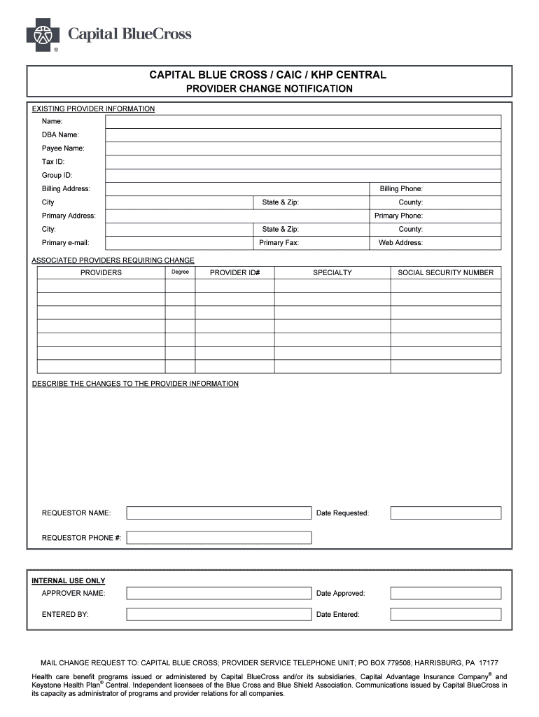 The Capital Blue Cross Provider Change Notification is a form used by healthcare providers to update their information with Capital Blue Cross.