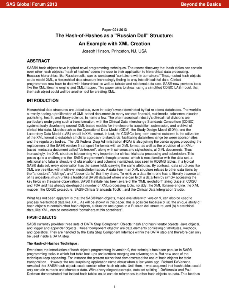 SAS Global Forum 2013Beyond the BasicsPaper 0212013The HashofHashes as a “Russian Doll Structure: An Example with XML Creation Joseph Hanson, Princeton, NJ, USA ABSTRACT SAS9 hash objects have inspired