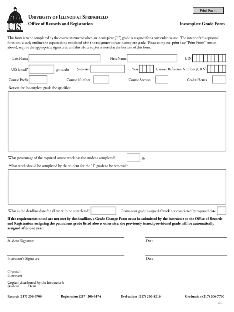 Office of Records and RegistrationIncomplete Grade Forms form is to be completed by the course instructor when an incomplete (I) grade is assigned for