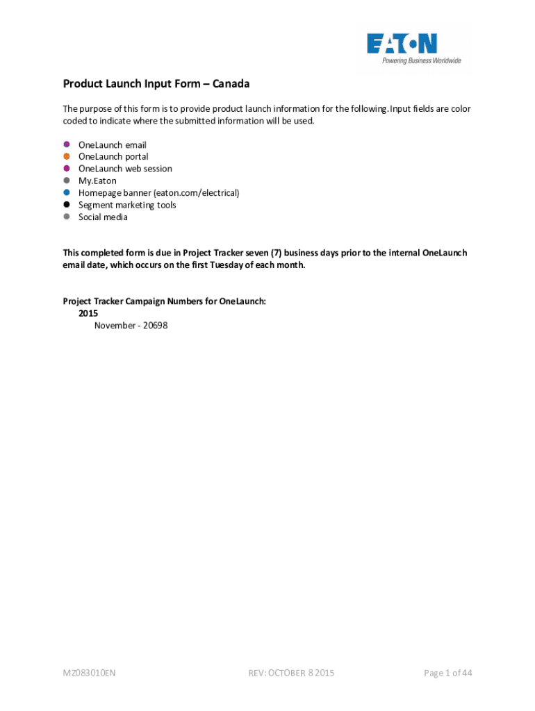 Get the free Product Launch Input Form Canada - Eaton