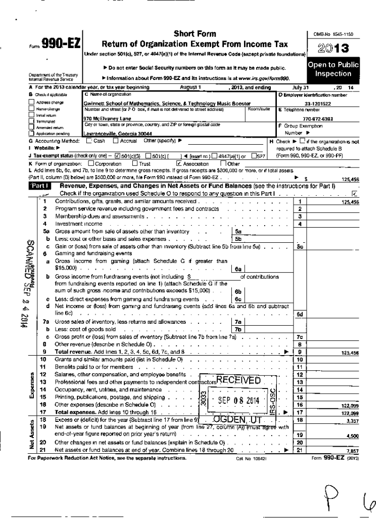 Short Form Return of Organization Exempt From Income Reinform 990EZOMB No 154511502013Under section 501(c), 527, or 4947(a)(1) of the Internal Revenue Code (except private foundations) Do not enter
