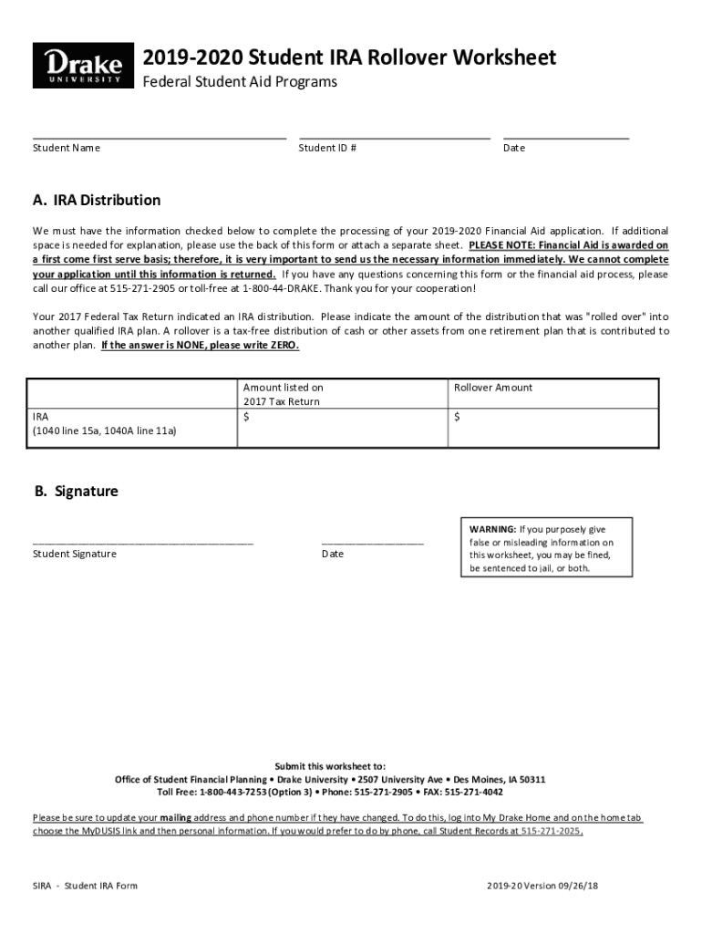 20192020 Student IRA Rollover Worksheet
