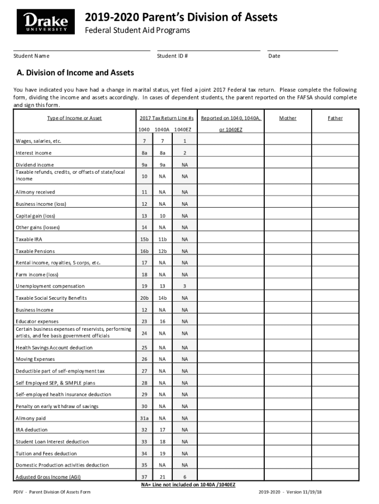 Get the free 2019-2020 Parent's Division of Assets - Drake University