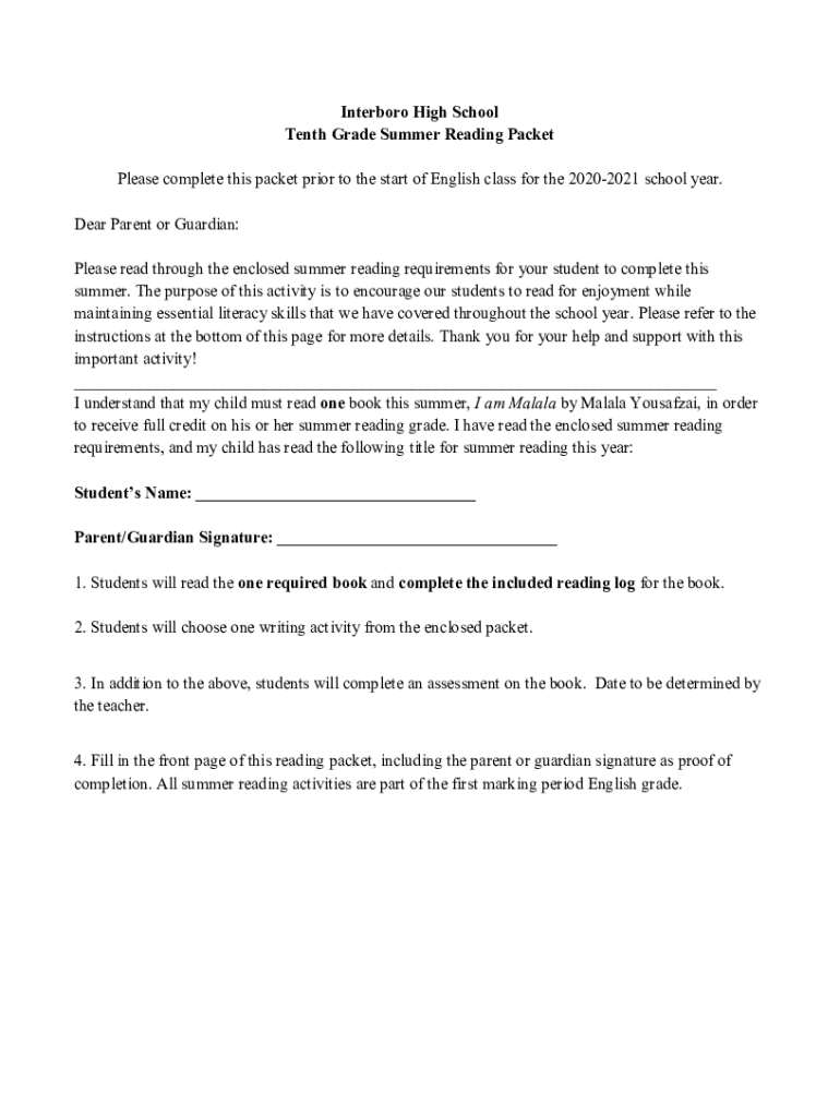 Get the free Interboro High School Tenth Grade Summer Reading Packet Please ...