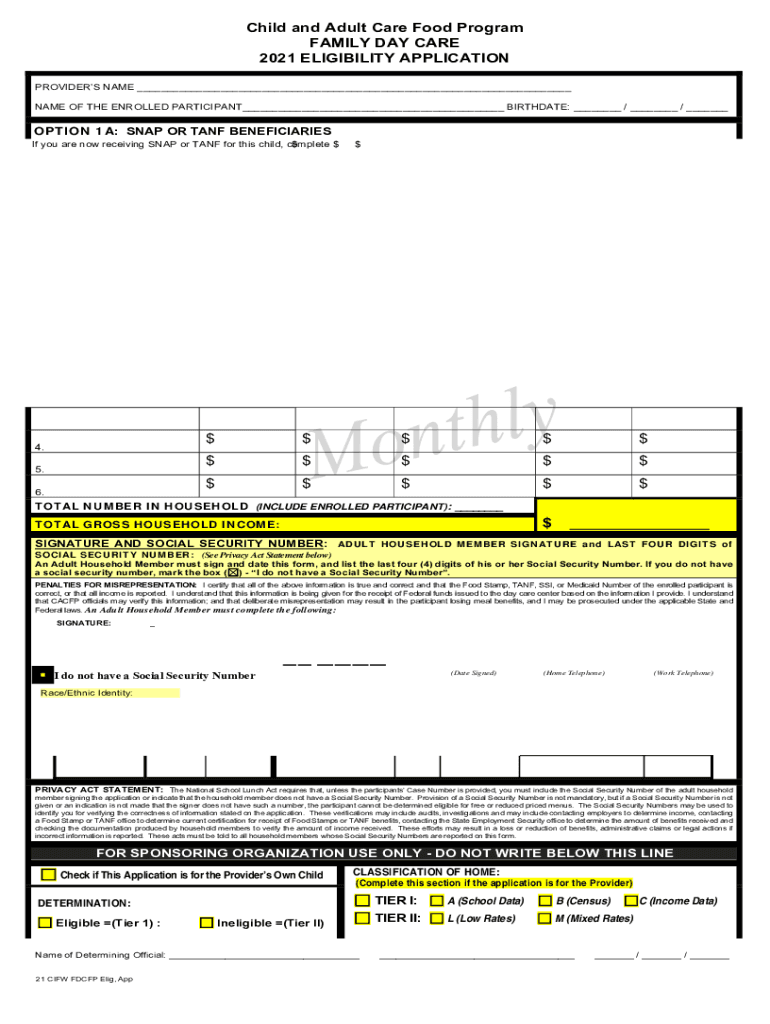 Child and Adult Care Food Program FAMILY DAY CARE 2021 ELIGIBILITY APPLICATION PROVIDERS NAME OF THE ENROLLED PARTICIPANT BIRTHDATE: / / OPTION 1A: SNAP OR TANK BENEFICIARIES If you are now receiving