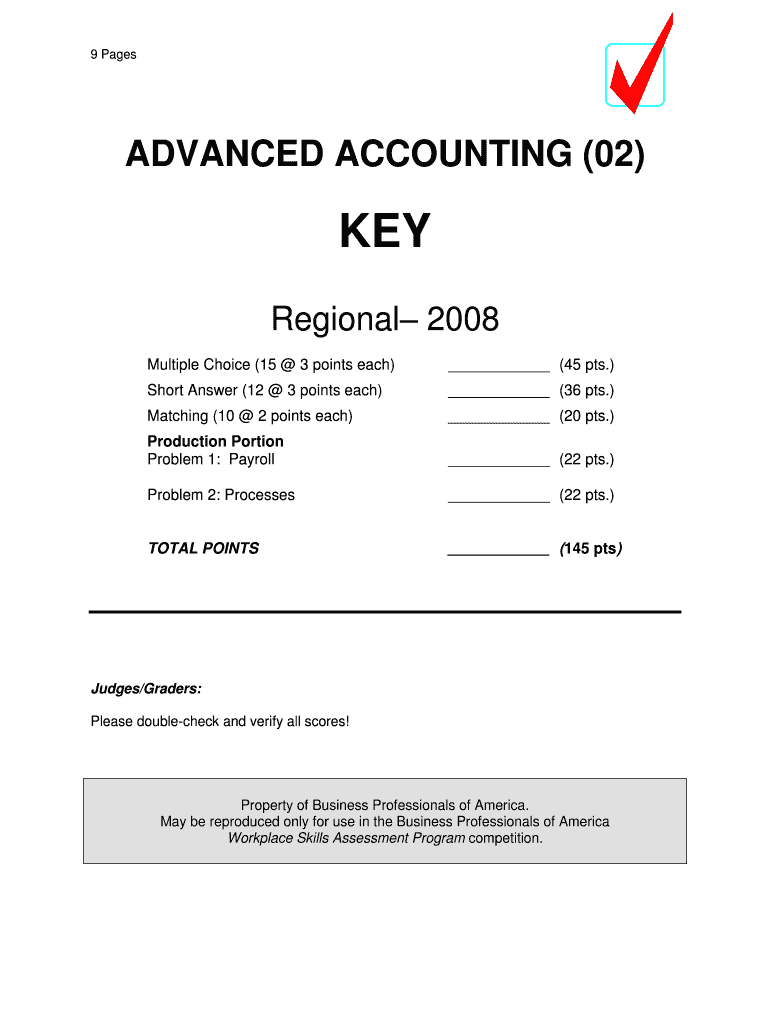 9 Pages ADVANCED ACCOUNTING (02) KEY Regional 2008 Multiple Choice (15 3 points each) (45 pts.) Short Answer (12 3 points each) (36 pts.) Matching (10 2 points each) (20 pts.) Production Portion Problem