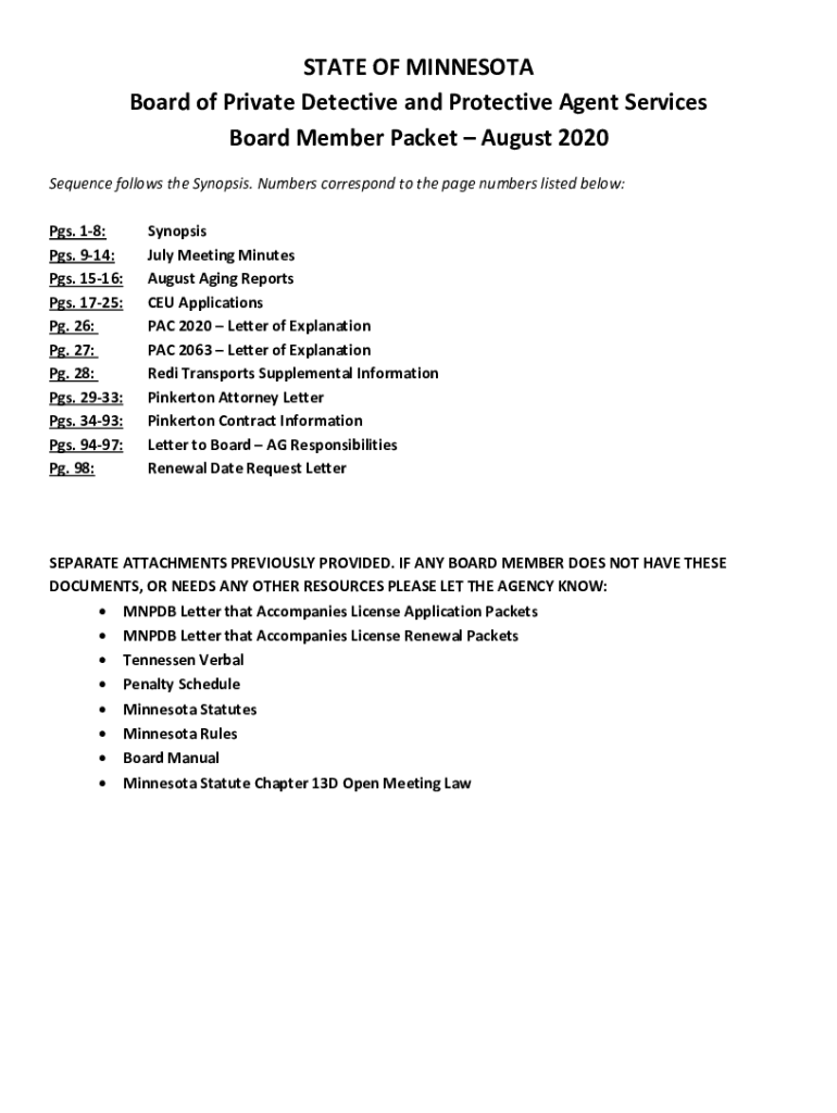 STATE OF MINNESOTA Board of Private Detective and Protective Agent Services Board Member Packet August 2020 Sequence follows the Synopsis. Numbers correspond to the page numbers listed below: Pgs.