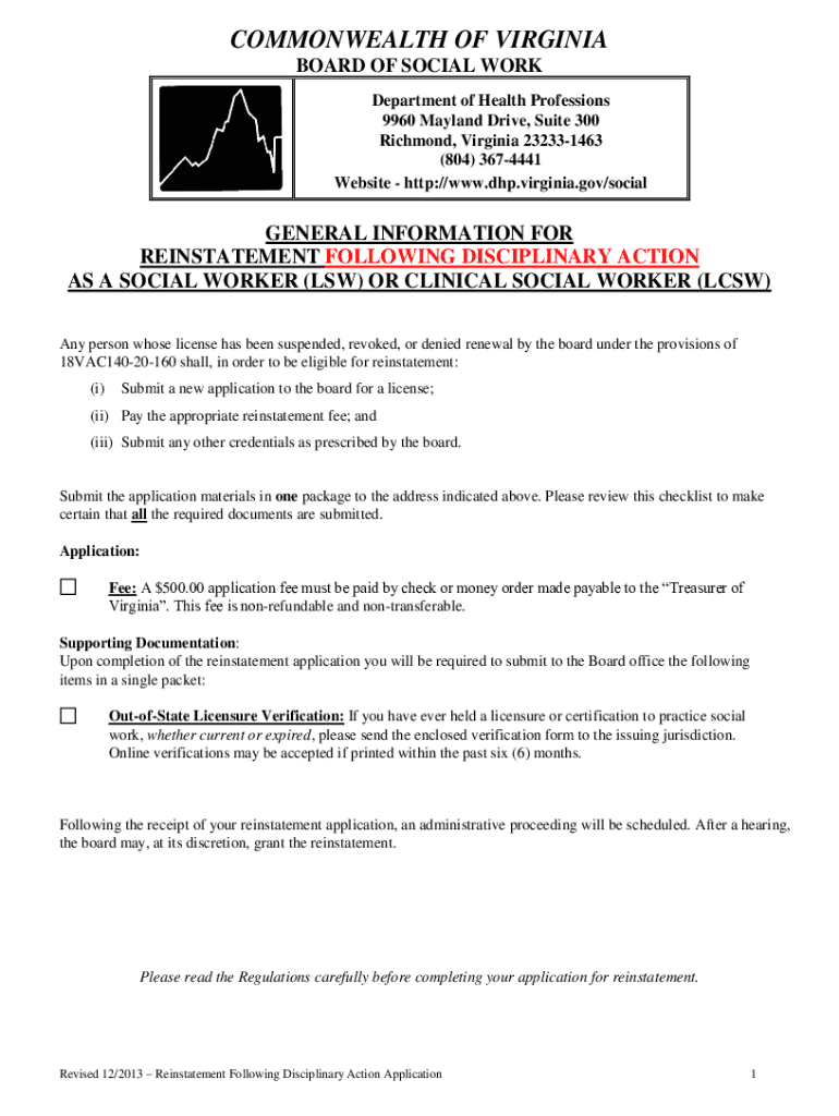 COMMONWEALTH OF VIRGINIA BOARD OF SOCIAL WORK Department of Health Professions 9960 Maryland Drive, Suite 300 Richmond, Virginia 232331463 (804) 3674441 Website http://www.dhp.virginia.gov/socialGENERAL
