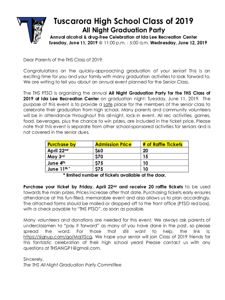 Tuscarora High School Class of 2019 All Night Graduation PartyAnnual alcohol & drug free Celebration at Ida Lee Recreation Center Tuesday, June 11, 2019 11:00 p.m. 5:00 a.m. Wednesday, June 12, 2019Dear