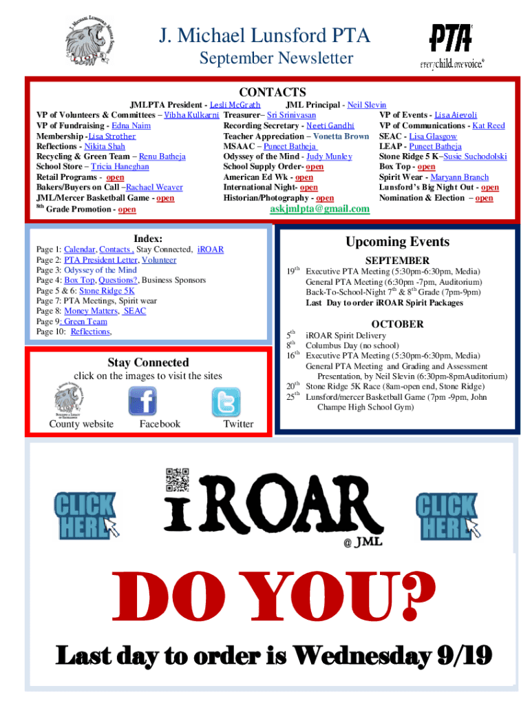 J. Michael Lunsford PTA September Newsletter CONTACTSJMLPTA President Leslie McGrath XML Principal Neil Seven VPs of Volunteers & Committees Via Kulhari Treasurer Sri Srinivasan VP of Events Lisa