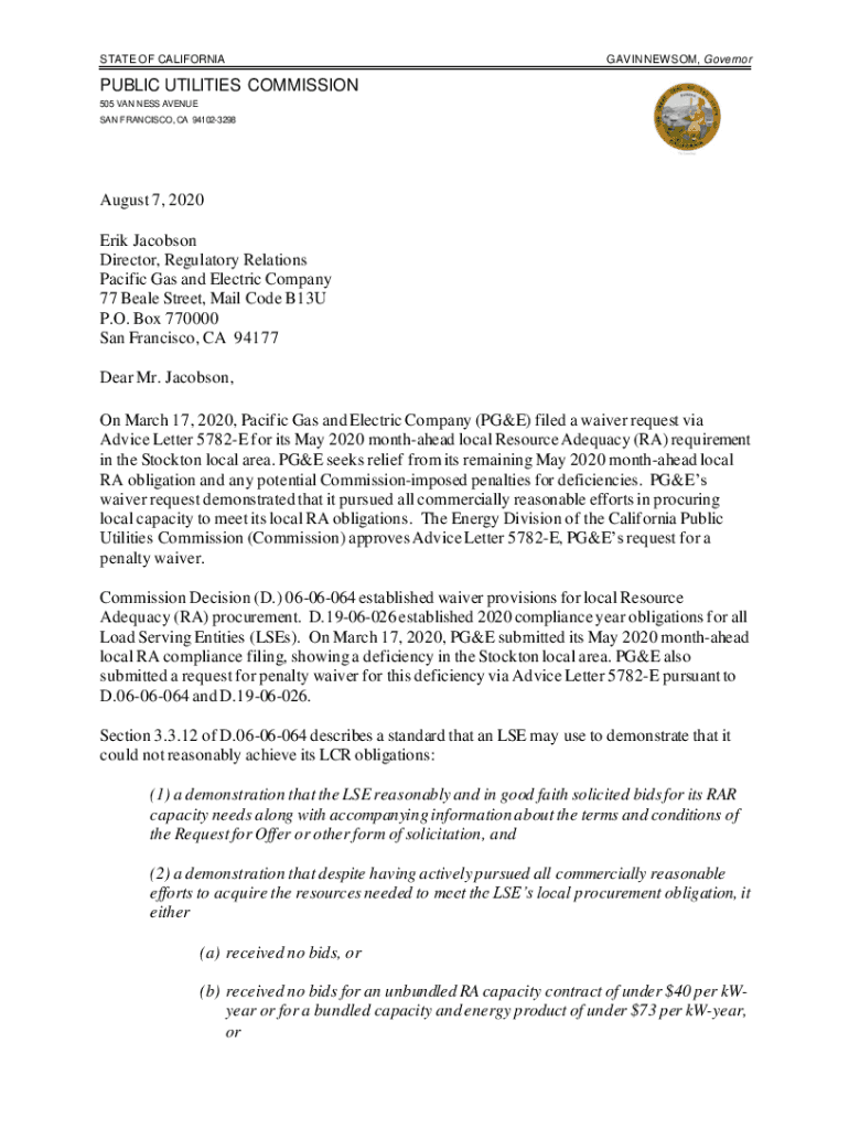 STATE OF CALIFORNIAGAVIN NEWSOM, GovernorPUBLIC UTILITIES COMMISSION 505 VAN LESS AVENUE SAN FRANCISCO, CA 941023298August 7, 2020 Erik Jacobson Director, Regulatory Relations Pacific Gas and Electric