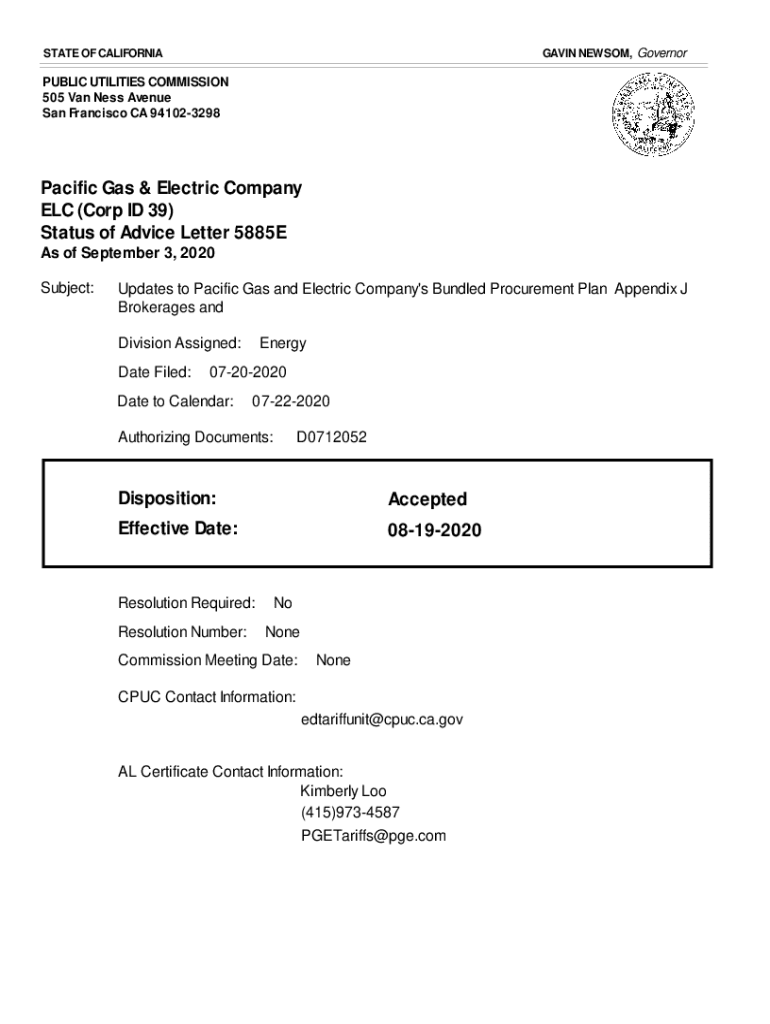 GAVIN NEWSOM, Governorate OF CALIFORNIAPUBLIC UTILITIES COMMISSION 505 Van Less Avenue San Francisco CA 941023298Pacific Gas & Electric Company ETC (Corp ID 39) Status of Advice Letter 5885E As of