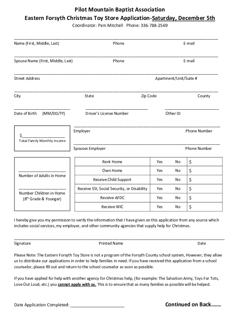 Pilot Mountain Baptist Association Eastern Forsyth Christmas Toy Store Application Saturday, December 5th Coordinator: Pam Mitchell Phone: 3367882569 Name (First, Middle, Last) Phone Email Spouse