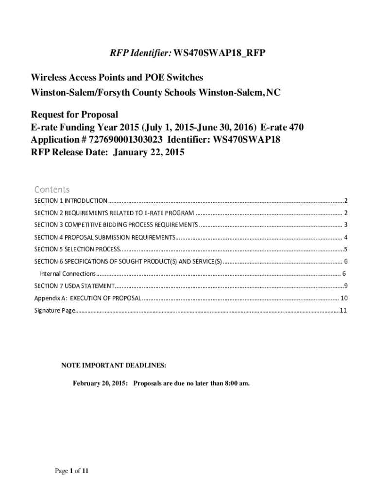 RFP Identifier: WS470SWAP18 RFP Wireless Access Points and POE Switches Winston-Salem/Forsyth County Schools Winston-Salem, NC Request for Proposal Rate Funding Year 2015 (July 1, 2015June 30, 2016)
