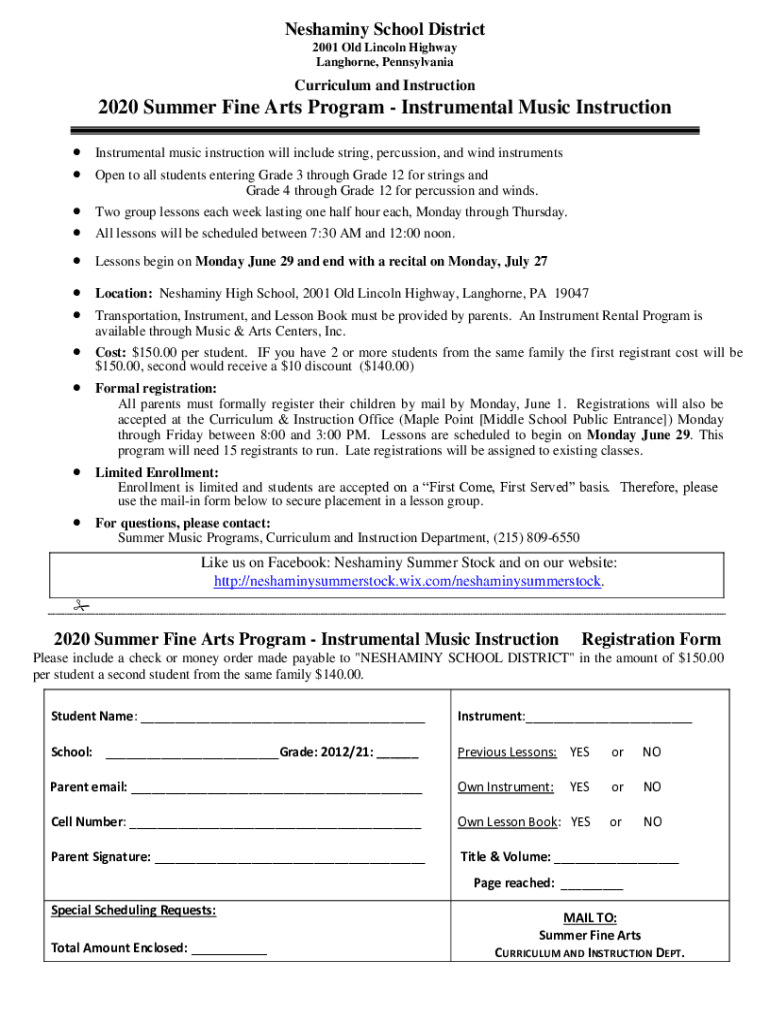 Reshaping School District 2001 Old Lincoln Highway Langhorne, PennsylvaniaCurriculum and Instruction2020 Summer Fine Arts Program Instrumental Music Instruction Instrumental music instruction will