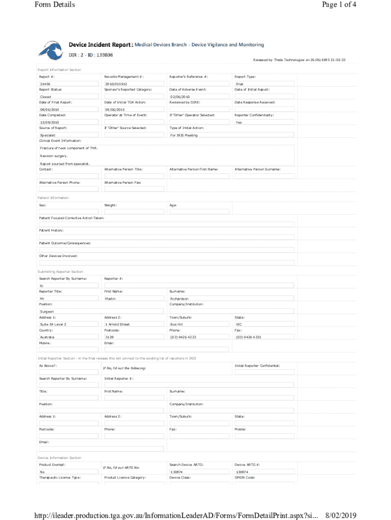 Form Details Page 1 of 4Medical Devices Branch Device Vigilance and Monitoring Released by Theta Technologies on 26/06/1985 21:02:22 Report Information Section Report #:Records Management #:Reporter's