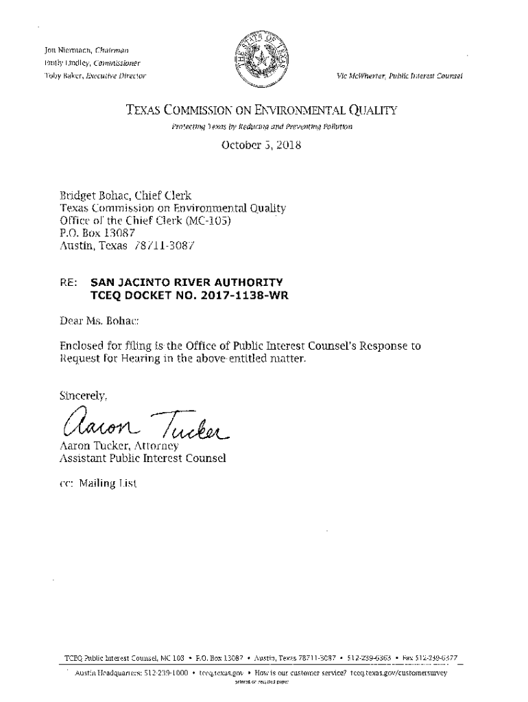 Toby Baker, Executive DireclOrVic McWhirter, Public Interest CounselTEXAS COMMISSION ON ENVIRONMENTAL QUALITY