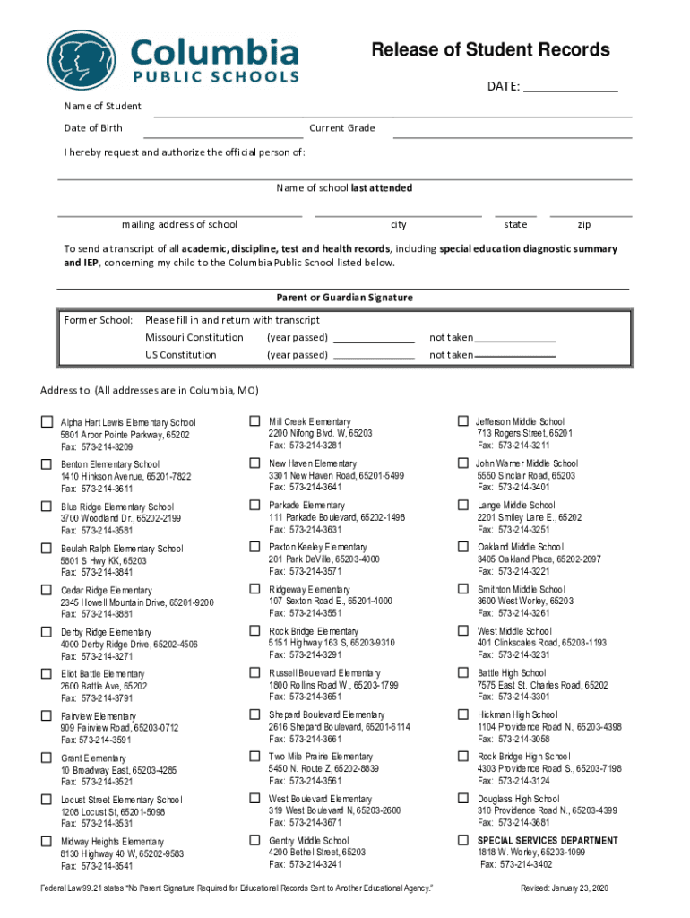 Release of Student Records DATE: Name of Student Date of BirthCurrent Grade hereby request and authorize the official person of: Name of school last attended mailing address of schoolcitystatezipTo