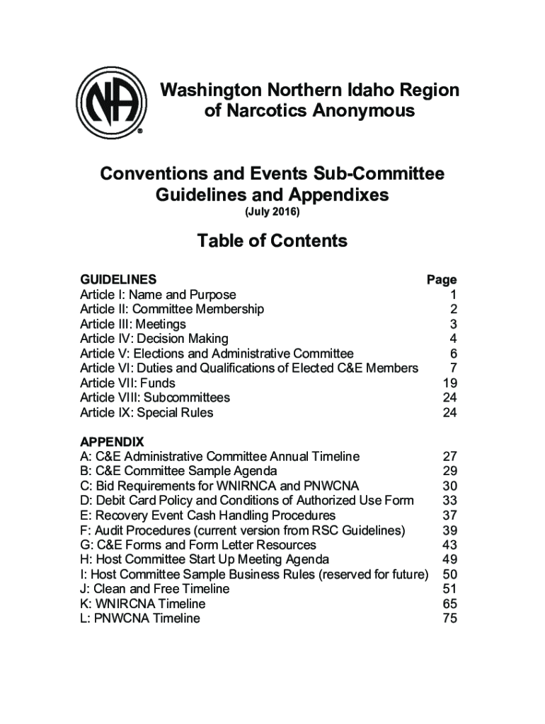 Washington Northern Idaho Region of Narcotics Anonymous Conventions and Events Subcommittee Guidelines and Appendixes (July 2016)Table of Contents GUIDELINES Page Article I: Name and Purpose 1 Article