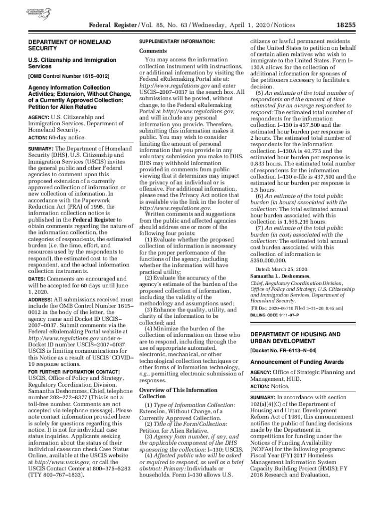 Federal Register / Vol. 85, No. 63 / Wednesday, April 1, 2020 / Notices SUPPLEMENTARY INFORMATION:DEPARTMENT OF HOMELAND SECURITY U.S. Citizenship and Immigration Services OMB Control Number 16150012
