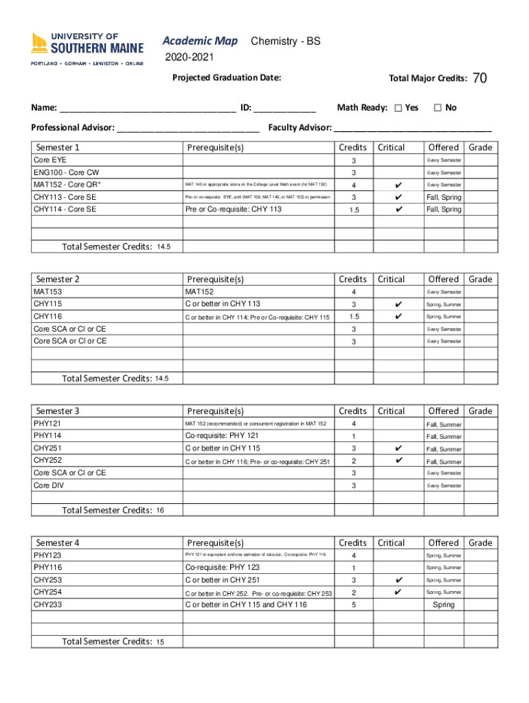 Academic Chemistry BS20202021 Projected Graduation Date: Name: ID: Total Major Credits: Math Ready:Yes70NoProfessional Advisor: Faculty Advisor: Semester 1Prerequisite(s)Core EYECritical3ENG100 Core