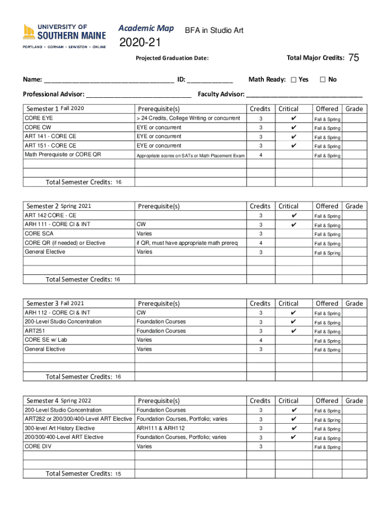 Academic Map BFA in Studio Art202021 Total Major Credits:Projected Graduation Date:Name: ID: Math Ready:Yes75NoProfessional Advisor: Faculty Advisor: Semester 1 Fall 2020Prerequisite(s)CreditsCriticalOfferedCORE