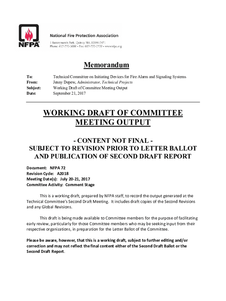 Memorandum To: From: Subject: Date:Technical Committee on Initiating Devices for Fire Alarm and Signaling Systems Jenny Deep, Administrator, Technical Projects Working Draft of Committee Meeting Output