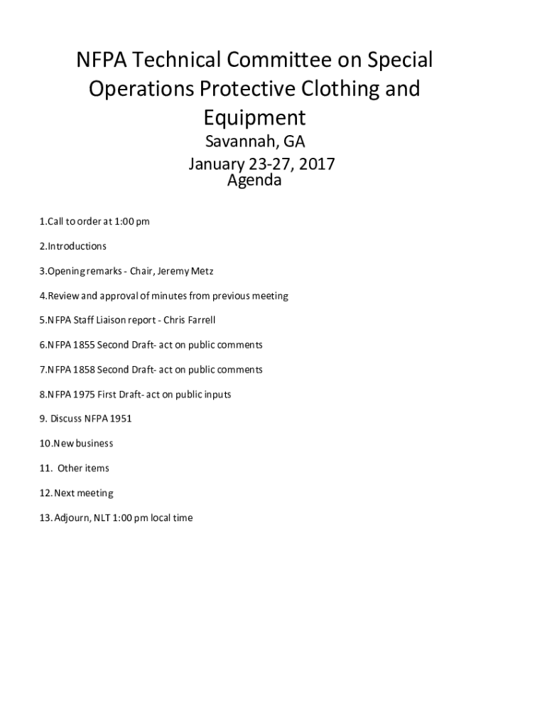 NFPA Technical Committee on Special Operations Protective Clothing and Equipment Savannah, GA January 2327, 2017 Agenda 1. Call to order at 1:00 pm 2. Introductions 3. Opening remarks Chair, Jeremy