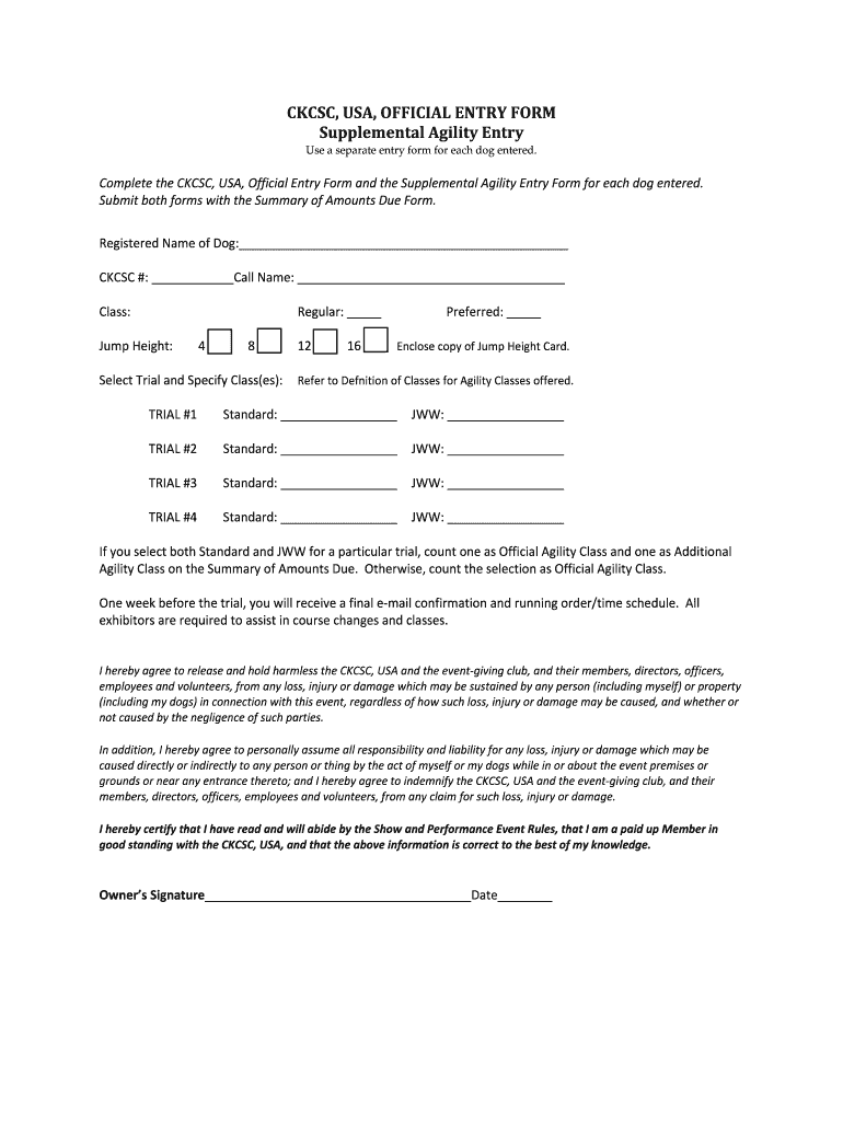 The CKCSC USA Official Entry Form is a regulated document used by dog owners to register their dogs for agility trials.