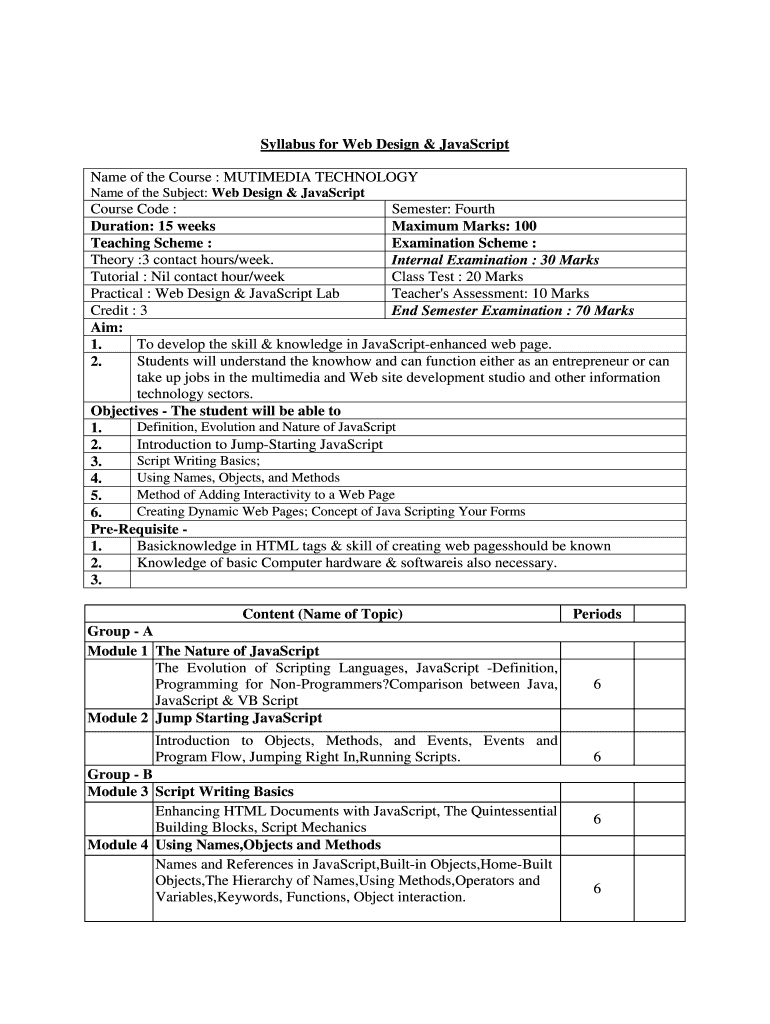Syllabus for Web Design & JavaScript Name of the Course : MULTIMEDIA TECHNOLOGY Name of the Subject: Web Design & JavaScript Course Code : Semester: Fourth Duration: 15 weeks Maximum Marks: 100 Teaching