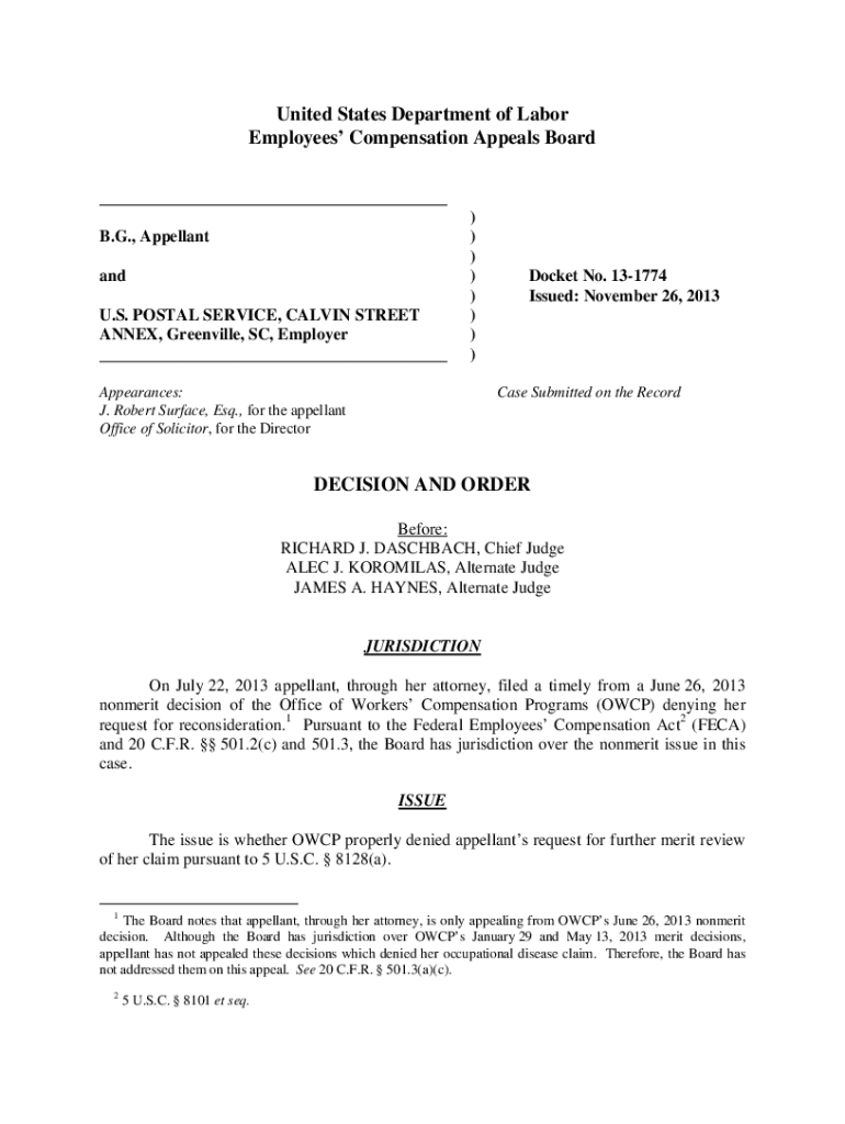 United States Department of Labor Employees Compensation Appeals Board B.G., Appellant and U.S. POSTAL SERVICE, CALVIN STREET ANNEX, Greenville, SC, Employer))))))))Appearances: J. Robert Surface,